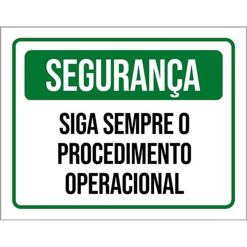Placa Segurança Siga Sempre Procedimento Operacional 36x46 Informações do Produto: Placas decorativas fabricadas com poliestireno de alto impacto PSAI de 2mm e impressão ultravioleta. - Medidas: 36cm x 46cm - Fixação: Todas as placas possuem adesivo dupla face para aplicação em qualquer tipo de superfície lisa. de 12 meses e disponibilidade imediata. Marca: Não Informado