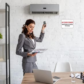 A placa Ar Condicionado. Mantenha a porta fechada serve para conscientizar sobre o uso eficiente do ar condicionado, ajudando a reduzir o consumo de energia e manter o ambiente na temperatura ideal. É recomendada para ambientes comerciais, residenciais e escritórios que utilizam ar condicionado. É indicado que a placa seja colocada em uma altura que a torne fácil de ser vista. Feita de plástico vinil PS de alta qualidade, ela garante durabilidade e resistência a condições ambientais moderadas.
