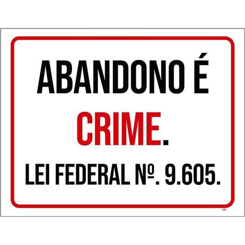 Placa Sinalização - Abandono É Crime Lei Federal 36x46 Informações do Produto: Placas decorativas fabricadas com poliestireno de alto impacto PSAI de 2mm e impressão ultravioleta. - Medidas: 36cm x 46cm - Fixação: Todas as placas possuem adesivo dupla face para aplicação em qualquer tipo de superfície lisa. de 12 meses e disponibilidade imediata. Marca: Não Informado Ean: 7794883704621