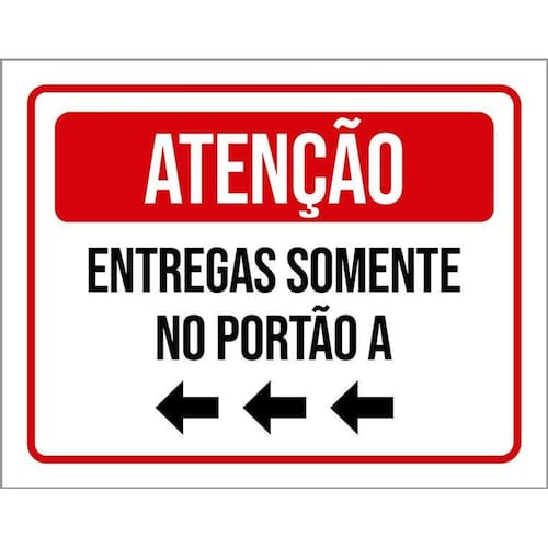 Placa Sinalização - Atenção Entregas Somente Portão 36x46 Informações do Produto: Placas decorativas fabricadas com poliestireno de alto impacto PSAI de 2mm e impressão ultravioleta. - Medidas: 36cm x 46cm - Fixação: Todas as placas possuem adesivo dupla face para aplicação em qualquer tipo de superfície lisa. de 12 meses e disponibilidade imediata. Marca: Não Informado Ean: 7794883754428
