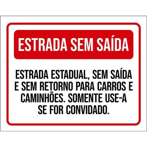 Placa Sinalização - Estrada Sem Saída 36x46 Informações do Produto: Placas decorativas fabricadas com poliestireno de alto impacto PSAI de 2mm e impressão ultravioleta. - Medidas: 36cm x 46cm - Fixação: Todas as placas possuem adesivo dupla face para aplicação em qualquer tipo de superfície lisa. de 12 meses e disponibilidade imediata. Marca: Não Informado