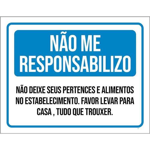 Placa Sinalização - Não Me Responsabilizo 36x46 - Informações do Produto: Placas decorativas fabricadas com poliestireno de alto impacto PSAI de 2mm e adesivo vinil automotivo de alta performance. - Medidas: 36cm x 46cm - Fixação: Todas as placas possuem adesivo dupla face para aplicação em qualquer tipo de superfície lisa. de 12 meses e disponibilidade imediata. Marca: Não Informado Ean: 7794882513095