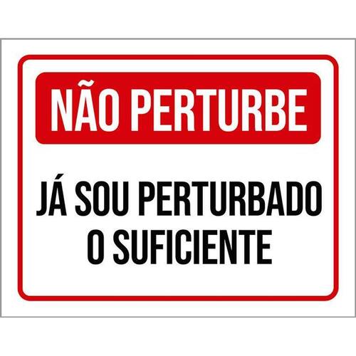 Placa Sinalização - Não Perturbe Sou Perturbado 36x46 Informações do Produto: Placas decorativas fabricadas com poliestireno de alto impacto PSAI de 2mm e impressão ultravioleta. - Medidas: 36cm x 46cm - Fixação: Todas as placas possuem adesivo dupla face para aplicação em qualquer tipo de superfície lisa. de 12 meses e disponibilidade imediata. Marca: Não Informado