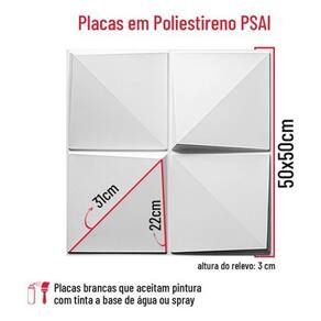 Placas Decorativas De Parede Ilove3d Luxo Modelos Cubos Quantidade do anuncio: 1m 4 placas Modelos: cubos Todas as placas são da cor branca As placas são de poliestireno PSAI plástico Tamanho: 50x50cm exceto modelos piramidal e prisma 48x 48cm Espessura: 0,5 mm ============================================================= 10 motivos do porquê você deve comprar as nossas placas 3D 1- Você mesmo consegue instalar, não precisa de um profissional; 2- Material resistente, o relevo não amassa e não afunda; 3- Instalação sem sujeira e sem quebra quebra; 4- Ideal para paredes com umidade, mofo, textura, madeira e azulejo; 5- Serve tanto para áreas internas, quanto externas; 6- É lavável; 7- Durabilidade de 10 anos; 8- Não precisa de pintura; 9- Instalação com fita dupla face ou cola de contato; 10- Cortes das placas é a laser. ============================================================= Fixação: Cola de contato secagem rápida , fita dupla face ou cola PU fixação 24 horas Ambiente: Interno e externo, podendo ser instalado sobre umidade, mofo, textura, vidro e madeira. Pintura: Tinta a base de água, acrílica, acetinado ou fosco. A pintura pode ser feita com compressor de ar, pincel ou spray. Marca: Lujp Decorações