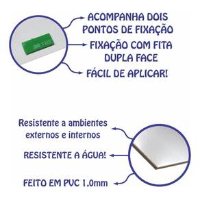Nossas placas são feitas em PVC com adesivo em vinil o que garante maior resistência ao tempo e 100% de resistência à água. Nossa impressão é feita de forma digital trazendo mais qualidade e resolução para as placas. No verso acompanha fita dupla face de alta resistência para que seja colado em qualquer objeto desde que ele se encontre limpo.