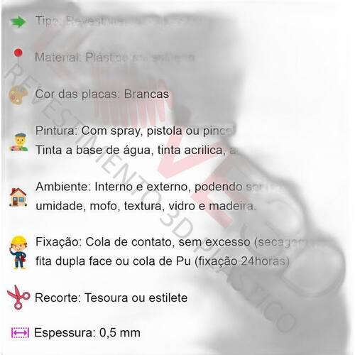 Essas placas são fabricadas em poliestireno PSAI plástico de alta qualidade, o que garante a resistência e durabilidade do produto. Seu relevo não amassa e não afunda, mantendo a beleza e o aspecto tridimensional por muito tempo.