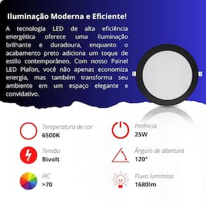 Com o Painel Plafon Redondo Embutir 25W Preto Luz Branca 6500K, você terá uma iluminação eficiente, duradoura e com um design elegante para transformar o seu ambiente em um espaço único e sofisticado. Não perca tempo e adquira já o seu!