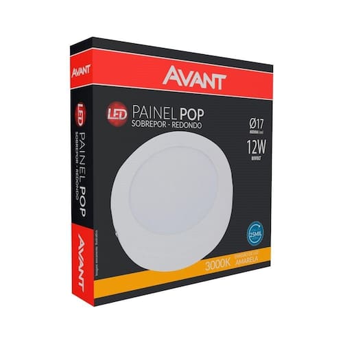 Características Principais do Produto: Cor: Branco Cor da Luz: Amarela Formato: Redondo Marca: Avant Potência: 12W Quantidade de Lúmens: 720 Lúmens Tamanho: 17 cm Tipo de Plafon: Painel LED Tipo de instalação: Sobrepor Voltagem: Bivolt