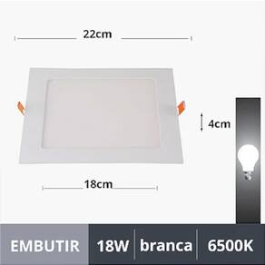 Marca: Lorben Cor: Branco Material: ABS Voltagem: 127/220V Tipo de lâmpada: LED Potência: 18W Formato: Quadrado Medida da Furação no teto: 22cm Profundidade para embutir: 18mm Tipo de instalação: Embutir Cor da luz: Branco luz do dia Vida útil do led: 50.000 horas Temperatura da luz: 6500k Fluxo luminoso: Aproximadamente 1000 a 1500 lúmens Eficiência luminosa: Aproximadamente 85 lúmens Ângulo de abertura: 120° Ta: 45°C - Tc: 85°C