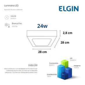 Plafon painel quadrado sobrepor 24w elgin branco frio 6500k Cor: branco Plafon painel quadrado sobrepor 24w elgin branco frio 6500k A luminaria led ultra slim da elgin deve ser usada em ambientes internos para iluminação geral, possui excelente desempenho e baixo consumo de energia. Disponivel na versão sobrepor. Sua estrutura em aluminio injetado otimiza a dissipação de calor, garantindo alta durabilidade. Com sistema de difusor que proporciona luz uniforme, sem pontos de led aparentes. Possui um design ultra fino, elegante e de facil instalação. O driver está incluso e deve ser conectado com a fiação sem emendas Dados técnicos:- potência: 24w;- tensão de entrada: 100 240v;- dimensões: 28 x 28 x 2,8 cm;- corrente (127/220v): 378ma/218ma;- temperatura de operação: -20c + 40c;- irc: 70;- frequencia: 50/60hz;- temperatura da cor: 6500k luz branca;- fluxo luminoso: 1920 lm;- eficiência luminosa: 80 lm/w;- grau de proteção: ip20.