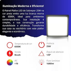 O Painel Plafon Quadrado Sobrepor 25W Preto Branco Frio 6500K é a escolha perfeita para quem busca aliar funcionalidade e elegância na iluminação de seus ambientes. Com um design moderno e sofisticado, este plafon LED irá transformar seus espaços favoritos em verdadeiras experiências luminosas memoráveis.
