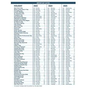 O planejador mensal Wirebound apresenta uma capa de couro simulada em relevo e de duas peças para um visual profissional. As páginas de planejamento variam 24 meses, de janeiro de um ano, de dezembro a dezembro do ano seguinte. Os spreads de duas páginas por mês incluem grandes blocos diários governados (2-1/8" x 1-7/8") para notas detalhadas; Férias; contagem de dias/dias restantes; Programação de domingo a sábado; uma área de notas governadas ao longo do lado; e referência de meses passados e futuros perto do canto superior direito. O planejador não recarregável é impresso com tinta de soja em papel feito com uma alta porcentagem de material reciclado.