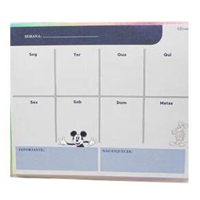 Especificações: - Marca: Zona Criativa - Personagem: Mickey - 100 Anos Disney - Licenciador: Disney - Tamanho Fechado: Altura: 2cm Largura: 16,5cm Comprimento: 19cm - Peso aproximado: 0,365gr - Capa dura - Material: Papel Offset - Quantidade de folhas: 240 notas adesivas em 3 designs, 80 lembretes adesivos e 70 folhas de Planner semanal - Cor: Prata Holográfico