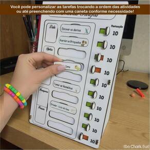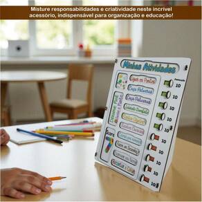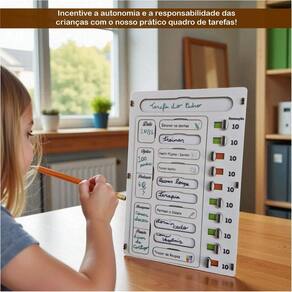 Quadro de Tarefas Diário - A ferramenta perfeita para organizar a rotina das crianças Transforme a rotina em um momento divertido, educativo e motivador O Quadro de Tarefas Diário Personalizável foi desenvolvido para ajudar crianças a criarem hábitos saudáveis, disciplina e maior independência no dia a dia. Ele já acompanha tarefas pré-definidas, como escovar os dentes, arrumar a cama, fazer lição, tomar banho, guardar brinquedos, entre outras. Mas se preferir, você também pode criar suas próprias tarefas de forma simples e rápida - ideal para rotinas específicas como terapias, horários de remédios, cuidados com o pet, combinados da casa, férias ou qualquer necessidade da família. Como funciona A cada tarefa realizada a criança marca no quadro e soma 10 pontos. No final do dia ou da semana, vocês podem comparar o total, definir recompensas positivas e acompanhar a evolução de maneira visual e lúdica. Benefícios: Desenvolve autonomia e senso de responsabilidade Facilita a comunicação entre pais e filhos Ajuda a manter a rotina organizada Motiva pelo sistema de pontos Torna tarefas diárias mais leves e divertidas Estimula disciplina sem brigas e sem Características do Produto: Material: MDF cortado a laser de alta qualidade Medidas aproximadas: 24 cm x 16 cm Totalmente personalizável Acompanha plaquinhas de tarefas variadas Design moderno, limpo e muito atrativo para crianças Ideal para crianças de 3 a 12 anos Perfeito para: Rotina escolar Rotina de casa Educação Montessori Terapias Acompanhamento de tarefas específicas Organização visual infantil Transforme a rotina em uma experiência positiva e divertida para toda a família Garanta já o seu Quadro de Tarefas Diário e incentive a autonomia da criança desde cedo. Totalmente Personalizável Use as tarefas prontas ou escreva suas próprias atividades. Adapta-se a qualquer rotina Estimula Autonomia e Responsabilidade A criança visualiza o que precisa fazer, marca cada tarefa concluída e acompanha seu progresso. Sistema de Pontuação Motivador Cada tarefa vale 10 pontos Ótimo para criar desafios e recompensas educativas. Rotinas Mais Leves e Organizadas Ideal para casa, escola, terapia, rotina de férias ou cuidados com o pet. Material Durável e Seguro Produzido em MDF cortado a laser, acabamento premium e design pensado para o uso infantil. Fácil de Transportar e de Usar Leve, compacto e com troca rápida das plaquinhas de tarefas. Marca: Não Informado