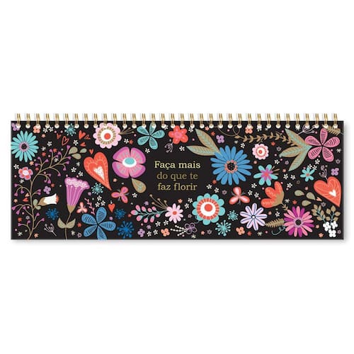 Capa dura, miolo com estampas variadas e coloridas, 52 folhas em papel offset 90g (canetas não passam para o outro lado!).