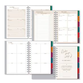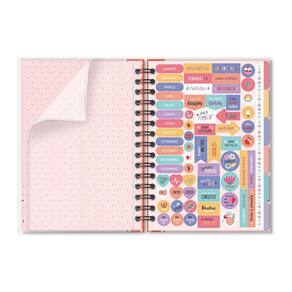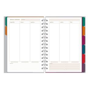 Capa dura, formato 14,5 cm x 20,5 cm, miolo com 160 páginas (80 folhas) em papel offset 90 g/m2 (a tinta das canetas não passa para o outro lado), encadernação em wire-o e elástico para fechamento. Acompanha folha de adesivos. Conteúdo: dados pessoais, meus objetivos, visão anual, minhas finanças, folhas pautadas e planejamento do dia.