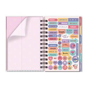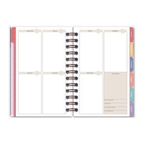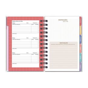 Capa dura, miolo com 210 páginas (105 folhas), formato 11,8 cm x 17,5 cm, papel offset 90 g/m2 (a tinta das canetas não passa para o outro lado), encadernação em wire-o e elástico para fechamento. Acompanham envelope para documentos, marcador de páginas, folhas de adesivos, 12 divisórias mensais. Conteúdo: calendário, dados pessoais, mais sobre mim, minhas metas, visão anual, ler/assistir/visitar, minhas viagens, cuide-se (bem-estar), visão mensal, inspirações para o mês, visão da semana, monitoramento de hábitos, minhas finanças e balanço do ano.
