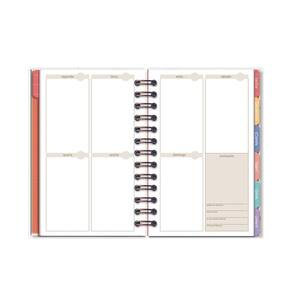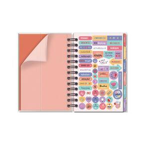 Capa dura, miolo com 210 páginas (105 folhas), formato 11,8 cm x 17,5 cm, papel offset 90 g/m2 (a tinta das canetas não passa para o outro lado), encadernação em wire-o e elástico para fechamento. Acompanham envelope para documentos, marcador de páginas, folhas de adesivos, 12 divisórias mensais. Conteúdo: calendário, dados pessoais, mais sobre mim, minhas metas, visão anual, ler/assistir/visitar, minhas viagens, cuide-se (bem-estar), visão mensal, inspirações para o mês, visão da semana, monitoramento de hábitos, minhas finanças e balanço do ano.