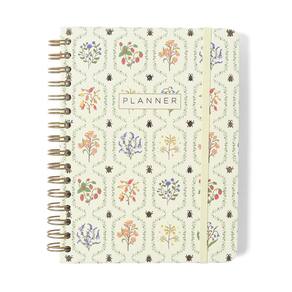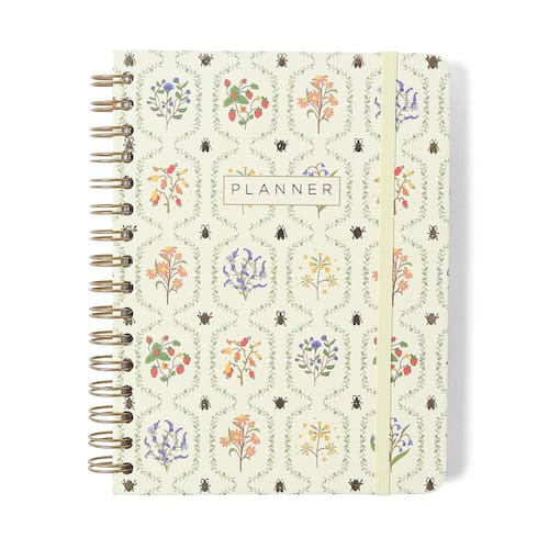 Este Planner tem capa dura, cantos arredondados, elástico para fechamento e encadernação em Wire-O (espiral duplo).
