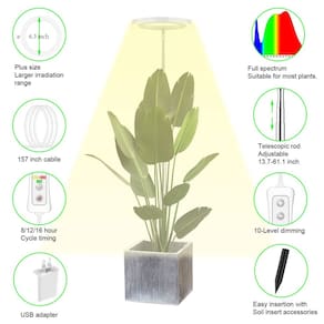 Luz de cultivo de plantas, yadoker LED de espectro completo para plantas de interior, altura ajustável, temporizador automático, baixa tensão segura de 5 V, ideal para luz de plantas grandes, pacote - Projetado para plantas grandes LED de espectro completo – luz de cultivo compacta com LEDs super brilhantes de alta qualidade, oferece espectro total de 380 nm-800 nm, incluindo LED branco 5000K/18, branco quente 3000K/18 LEDS, vermelho/8 LEDS, azul/4 LEDs para promover efetivamente o crescimento de plantas internas em qualquer época do ano, benéfico para todo o período de crescimento. - Altura ajustável de até 155 cm – a faixa de altura é de 35 a 155 cm. O mastro também faz telescópio para cima e para baixo, o que é útil, pode cultivar a planta para ficar em uma altura razoável, também cobrirá um espaço muito maior para iluminar mais plantas próximas quando estiver totalmente estendida. - Regulável em 10 níveis – o brilho pode ser ajustado, 10 configurações de brilho variando de 10% a 100%, você pode escolher o brilho mais adequado para o crescimento de suas plantas. - Cabo longo de 4 m – Agora você pode usar facilmente esta lâmpada de cultivo para suas plantas suspensas favoritas ou plantas maiores, não se preocupe com cordão extensível adicional. - Temporizador automático, interruptor liga/desliga – a lâmpada funciona a partir de um temporizador integrado com função de temporização de ciclo de 3 modos que permanece acesa por 8/12/16 horas e desligada por 16/12/8 horas. O temporizador se ajusta quando um liga, controle total quando a luz acende e desliga, basta ligar/desligar conforme necessário, não há necessidade de desconectar/reconectar.