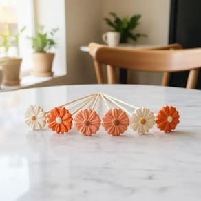 Cada flor é produzida manualmente em barro e madeira, formando um arranjo decorativo diferenciado.