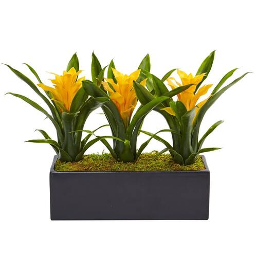 Nearly Natural 6953-YL Bromelia Artificial de 28 cm de Alto, Amarilla - Viene con una maceta rectangular - Ideal para mesas o espacios en mostradores - Las flores artificiales parecen reales - El musgo decorativo natural resalta el arreglo falso - Dimensiones: 28 cm de alto x 46 cm de ancho x 30 cm de profundidad