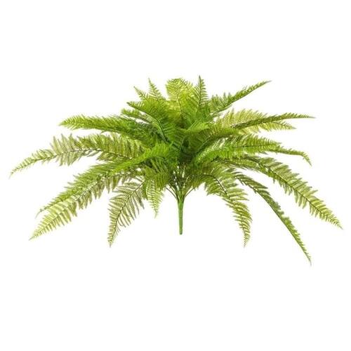 Arbusto de samambaia de couro verde Vickerman 31. Esta planta artificial mede 31 polegadas da parte inferior da folhagem mais longa até o topo da folhagem central. Ele contém 37 folhas verdes de plástico. É feito com material de toque real para imitar a sensação de uma planta natural. Inclui um ano de garantia UV. Especificações. Material: plástico, PE, ferro. Cor verde. Tamanho 31