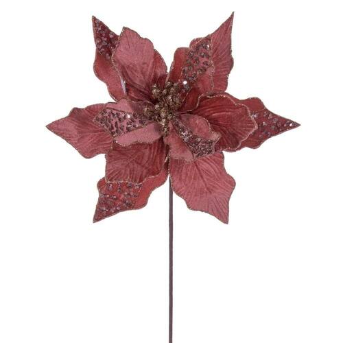 - Este caule de poinsétia cor de ouro rosa é feito de poliéster e arame e tem 20 polegadas de comprimento com uma cabeça de flor de 10 polegadas de diâmetro.