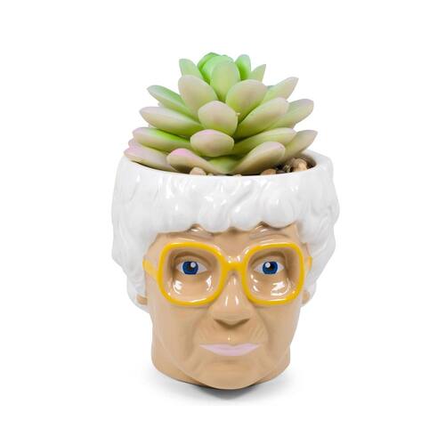 Este vaso de cerâmica de interior oficialmente licenciado The Golden Girls Sophia com planta suculenta falsa faz uma declaração! Perfeito para adicionar um toque de verde à sua prateleira, mesa de mesa ou peça central para mostrar seu amor pelas Golden Girls!