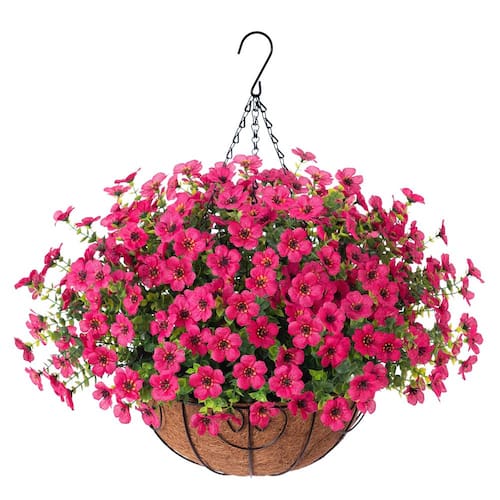 Vaso de flores artificiais com cesta suspensa para decoração de casa, margarida com folhas de eucalipto ao ar livre e jardim interno, cesta de metal com forro de coco com planta sintética - Lindas flores penduradas: as lindas flores HyeFlora penduradas em uma cesta são uma maneira simples e elegante de decorar e adicionar um pouco de beleza natural a qualquer espaço. - Materiais: A linda cesta de flores de seda falsa é composta por uma cesta de vime com correntes de metal e 12 ramos de flores artificiais de buganvílias. Cada galho suspenso tem garfos de flores e folhas verdes. Especificações: o tamanho após a montagem é de aproximadamente 39,9 cm x 39,9 cm x 48,3 cm (C x L x A); a cesta mede 30,5 x 30,5 x 15 cm (C x L x A) e o comprimento da corrente é de 35 cm. - Cestas artificiais suspensas com flores fornecem uma opção de baixa manutenção para adicionar beleza e cor a qualquer espaço, com uma variedade de opções de flores realistas disponíveis. - Boa qualidade: a cesta suspensa e as margaridas artificiais com folhas de eucalipto foram feitas de material de boa qualidade que não requer manutenção após a montagem. É resistente aos raios UV e não desbota, resistente o suficiente para qualquer clima. Sem necessidade de irrigação. Fica cheia e bonita durante toda a estação. - Decoração vegetal artística: a cesta de flores suspensa falsa parece real e elegante, tornando-a a cesta suspensa perfeita para sua casa, pátio, varanda, jardim, interior e exterior. Ela floresce o ano todo e adiciona uma sensação de primavera à sua casa.