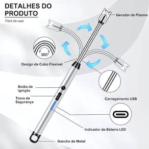 Plasma Tech Recarregável - Acendedor USB para Cozinha O isqueiro elétrico além de ser lindo e muito prático é recarregado pela conexão USB do computador, pelo carregador de celular, pela tomada, qualquer aparelho que tenha USB. Perfeito para ser em qualquer ambiente sem se preocupar com chuva ou vento. Nenhum gás ou combustível é necessário. Este isqueiro é adequado para acender , fogueiras, churrasqueiras, fogões de acampamento, lareiras, fornos e quaisquer outros usos óbvios. Não tem chama, por isso não é afetado pelo vento ou pela água. Você pode usá-lo sob quaisquer condições; faça chuva ou faça sol, perfeito para churrasco ao ar livre e viagem de acampamento. É recarregável contem um cabo para carregamento USB. O recurso de desligamento automático de 10 segundos garante um uso seguro que evita danos por temperatura muito alta. O pescoço longo e flexível pode ser girado em 360 graus e dobrado em diferentes direções para atender a diferentes aplicações. O design leve e compacto torna o isqueiro fácil de ser carregado e ideal para acampamentos, viagens, churrasco e atividades internas ou externas. Características adicionais: - Recarregável - Luzes indicadoras de bateria 4 Níveis - Flexível com Rotação em 360 - Isqueiro em Aço Inoxidável - Isqueiro a prova de vento pois não produz chamas - Não possui chamas é operado eletricamente Recomendado para uso em: - Acender velas - Fogão a Gás - Carvão Importante: - Recomendado deixar longe do alcance de Crianças Dimensões aproximadas: - Comprimento: 26 cm - Peso: 50g Material: - Aço inoxidável - Plástico ABS Itens incluso: - 1 Isqueiro Acendedor Eletrônico e Arco Flexível com USB - 1 Cabo de Carregamento Marca: Não Informado Ean: 7895688643297