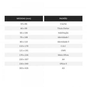Quantidade de folhas: 50; Espessura: 125 micras / 0,05mm; Acabamento: Brilhante; Medidas: 426mm x 303mm.