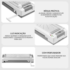 Ideal para quem busca praticidade, proteção e acabamento profissional em documentos, trabalhos escolares e materiais de uso diário. Com potência de 270W, garante aquecimento rápido e laminação eficiente, proporcionando maior durabilidade e resistência contra umidade, sujeira e desgaste.