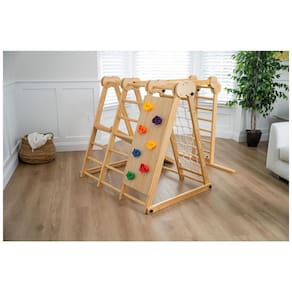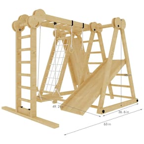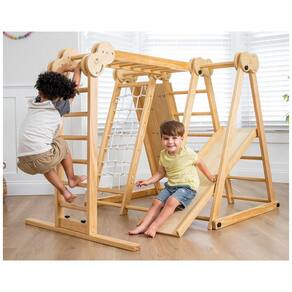 Playset 7-em-1: Inclui escorregador, parede de escalada, rede de escalada com corda, barras de macaco, balanço, anel ninja ginástico e slide. Estilo Montessori e Waldorf.