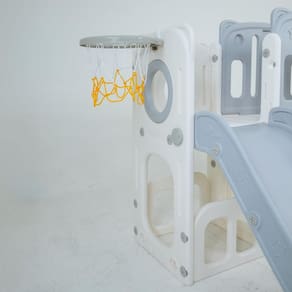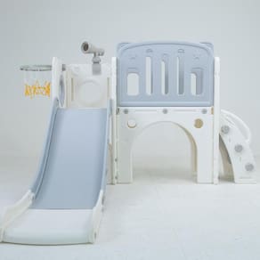 Com 2 torres, esse playground 5x1 inclui escorregador, cesta de basquete, luneta, guarda-brinquedos e túnel de passagem.