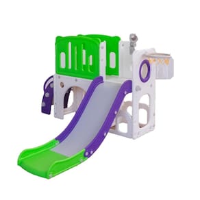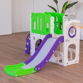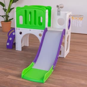 Com 2 torres, esse playground 5x1 inclui escorregador, cesta de basquete, luneta, guarda-brinquedos e túnel de passagem.
