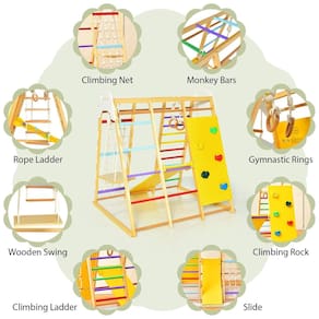 Este conjunto de brinquedos para crianças é um presente ideal para seus filhos e amigos. Com escorregador reversível, balanço de madeira, barras de macaco, argolas de ginástica, rede de escalada, escada de madeira, escada de corda e rocha de escalada, as crianças podem experimentar uma variedade de esportes neste parque infantil indoor.