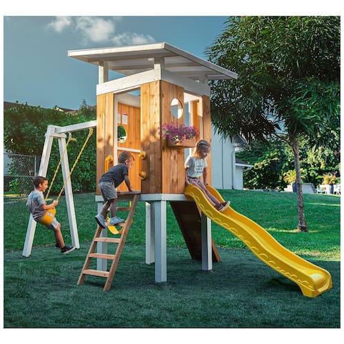 PAREDE DE ESCALADA, BALANÇOS, ESCORREGADOR, CASINHA E MAIS: O conjunto Avenlur é repleto de opções de brincadeira! Ele conta com uma casinha de brinquedo com janelas integradas e paredes fechadas, oferecendo sombra e proteção contra o sol, além de permitir boa ventilação e fácil supervisão. A parede de escalada é um desafio empolgante que estimula a atividade física e a coordenação motora. O escorregador de 1,80 m proporciona uma diversão emocionante, enquanto a viga de balanço com 2 posições e balanços de cinto resistentes, com correntes de corda, são perfeitos para mãos pequenas.