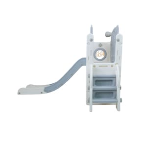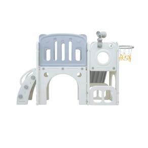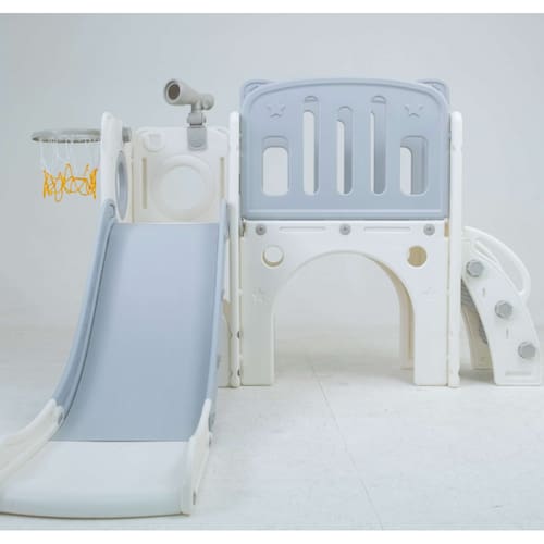 Com 2 torres que incluem escorregador, cesta de basquete, luneta e guarda-brinquedos.