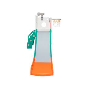 Com 1 torre que inclui escorregador, cesta de basquete, luneta e guarda-brinquedos.