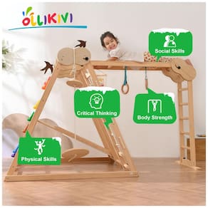 O Parque Infantil Indoor OLLIKIVI é uma inovação que oferece diversão e aprendizado para seu filho. Este playground Montessori 7 em 1 inclui escorregador sueco, parede de escalada, balanço, barras de macaco, rede de escalada com corda e escada de madeira. Perfeito para pais que buscam um brinquedo seguro e de qualidade para várias crianças.