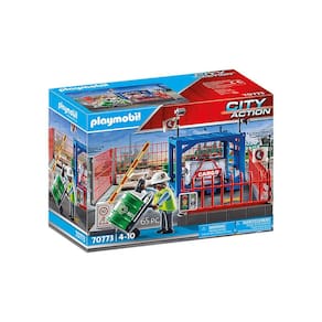 Se o transporte da carga não puder continuar imediatamente, a mercadoria fica temporariamente no depósito de carga. Sejam contêineres, toneladas ou sacos - tudo é armazenado com segurança aqui. Um novo contêiner acaba de chegar. Ele deve ser armazenado temporariamente por alguns dias. Por razões de segurança, o estivador também prende o contêiner à placa de base com uma corda. Agora nada pode escorregar. O playset inclui uma figura PLAYMOBIL, elementos de cerca, uma barreira, um módulo de contêiner e muitos outros extras.