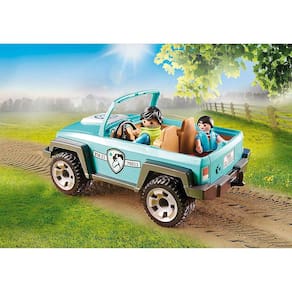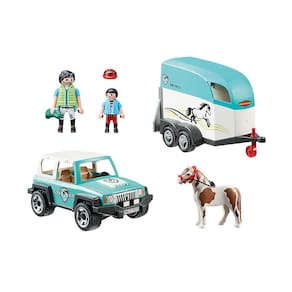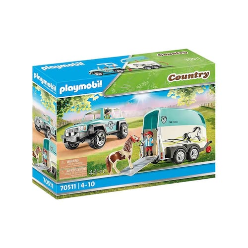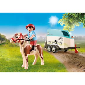 Se um pônei precisa ir ao veterinário, ele é transportado com o espaçoso Pony Trailer. O garotinho acompanha cuidadosamente seu pônei pela rampa até o trailer. Isso não é tão fácil, mas juntos os dois conseguem. Uma vez que o pônei está no trailer, a rampa é dobrada e o trailer é acoplado ao carro.