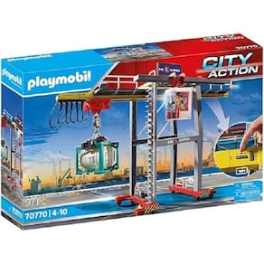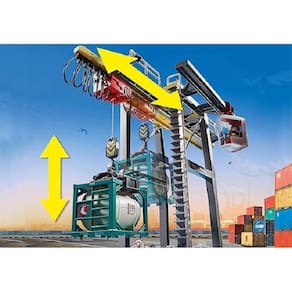 O porto está sempre repleto de atividade. Novos navios porta-contêineres chegam a cada minuto e precisam ser carregados e descarregados rapidamente. Mas, graças ao guindaste de carga elétrico, o cronograma apertado pode ser cumprido facilmente. Alegremente, o operador do guindaste senta-se a uma altura vertiginosa em sua cabine e levanta até os contêineres mais pesados ??sem esforço para o navio que aguarda. Terminado - a viagem pode continuar. Assim, as rotas de carga entre terra, água e áreas de armazenamento podem ser alteradas de forma rápida e segura. O conjunto inclui uma figura PLAYMOBIL, um guindaste de carga elétrico, um contêiner com estrutura e barril, um colete de proteção e muitos outros acessórios. Sobre rodas, o guindaste pode ser movido longitudinalmente para carregar vários contêineres em fila.