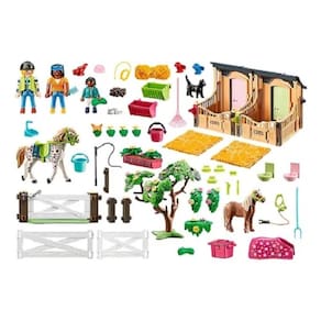 alope em aventuras divertidas com as aulas de equitação. Duas barracas lindamente construídas estão equipadas com todas as necessidades para ensinar os recém-chegados a montar. O instrutor começa mostrando à criança a importância de cuidar e cuidar de um cavalo. Assim que a pelagem do cavalo está brilhando, o instrutor ajuda a garota a subir no pônei e a aula começa! O pátio cercado oferece amplo espaço para aulas com o cavalo e o pônei, enquanto os cavaleiros aprendem a manobrar seu novo amigo. A mãe da menina fica perto da cerca para animá-la! Quando as aulas terminarem, retire a sela e a noiva do cavalo e pendure-os na baia. O conjunto inclui duas figuras adultas, uma figura infantil, estábulo, esgrima, selas, capacetes, ração, forcado, caixa de flores, cobertor de cavalo e muitos outros acessórios de equitação.