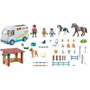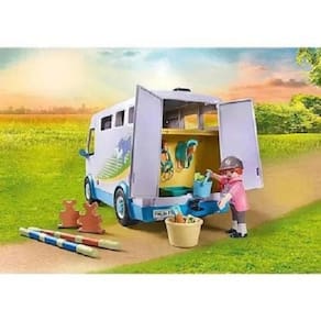 "A professora Joana tem tudo pronto para a aula de equitação. O veículo pode transportar até dois póneis ou cavalos, além da cabine de condução com dois assentos. Acima da bagageira encontram-se dois compartimentos para dormir e graças às partes do tejadilho desmontável, o interior do transporte é perfeito para brincar. Com abrigo, cerca flexível e inúmeros acessórios para o cuidado dos cavalos e póneis. Kira e os seus amigos mal podem esperar para finalmente montar nos póneis Embarca nas fabulosas aventuras no Rancho Waterfall e na Escola de Equitação Móvel da PLAYMOBIL. A instrutora de equitação Joana chega ao centro equestre com o seu transporte de cavalos. No seu espaçoso transportador, há espaço para dois cavalos, e sobre a bagageira, há dois espaços para dormir caso as aulas de equitação se prolonguem. Os equipamentos de equitação e os acessórios para cavalos são armazenados no porta-malas. Há um picadeiro disponível para os póneis. As crianças esperam com entusiasmo as lições de equitação
