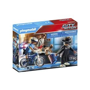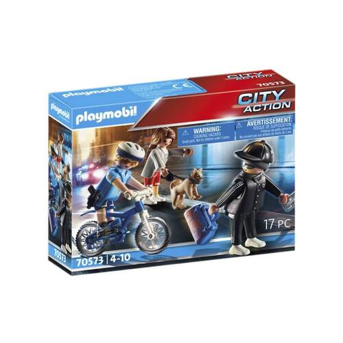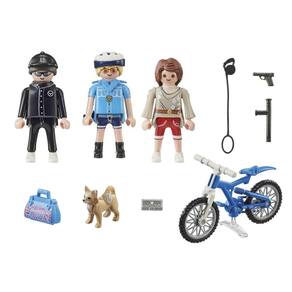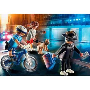 Esse conjunto inclui um policial Playmobil equipado com uma bicicleta, pronta para perseguir o fugitivo. Com muita agilidade, o policial irá atrás do ladrão que assaltou uma moradora da cidade, levando sua bolsa e carteira. Será que o policial conseguirá capturar o fugitivo?