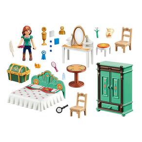 "Mobiliário para o quarto aconchegante de Lucky com penteadeira, arca do tesouro e tesouros. Crie novas aventuras no quarto de Lucky. Lucky pode ser encontrada aqui quando ela está estudando ou fazendo planos para si mesma, o Espírito e seus amigos. Ela mantém suas lembranças preciosas no baú do tesouro e pode facilmente guardar suas roupas no armário espaçoso. Na frente da linda penteadeira, Lucky se prepara de manhã, então ela se senta na frente do grande espelho e escova os cabelos. O cenário da peça contém Lucky, penteadeira, mesa e duas cadeiras, guarda-roupa, livros, perfume, troféu, jarra e muitos outros acessórios. Figuras: 1 sorte; Acessórios: 1 cama, 1 guarda-roupa, 1 penteadeira, 1 mesa, 2 cadeiras, 1 banquinho, 1 baú, 1 xícara, 1 fita de torneio, 2 livros, 1 garrafa, 1 jarro de água, 1 pente, 1 escova, 1 frasco de cosmético, 1 lupa, 1 pena, 1 flor, 1 pedra, 3 pedras de vidro "