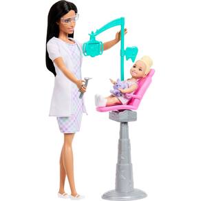- O conjunto temático da carreira inclui boneca dentista Barbie, uma boneca pequena bebê, cadeira de dentista com luz superior e 8 acessórios.