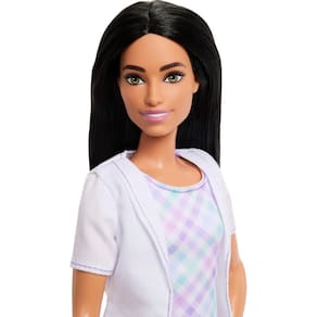 - Vestindo um clássico jaleco branco, a boneca dentista Barbie está pronta para a diversão de interpretar papéis!